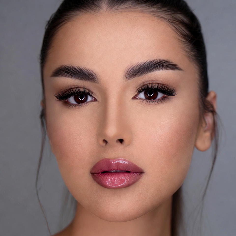 A young woman with dark hair in a ponytail gazes at the camera on a gray background. She has bold arched eyebrows, long dark eyelashes, and full lips coated in shiny pink gloss. Her skin is smooth with subtle highlighter on the cheeks and nose.