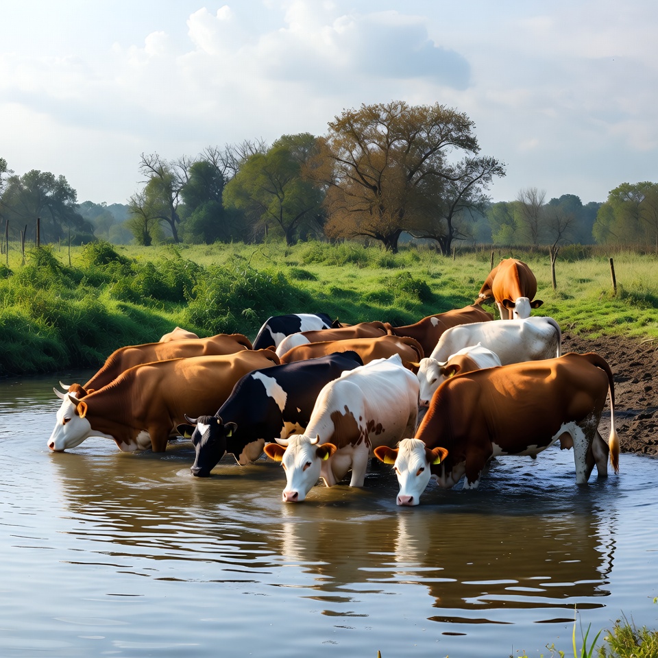 A herd of black and white Holstein cows drinks from a muddy riverbank surrounded by lush green grass. Several brown cows join them in the shallow water under a partly cloudy sky. Autumn trees line the background fence.