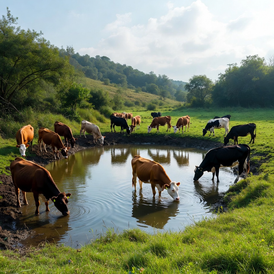 A herd of black, white, and brown cows drinks water from a small muddy pond surrounded by lush green grass. The scene is set in a sunny rural landscape with rolling hills, trees, and scattered clouds in the background. Reflections of the cows appear in the calm water surface.