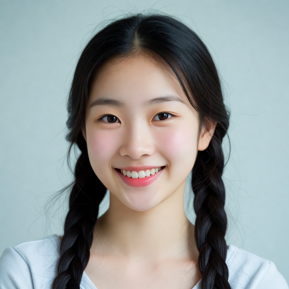 beautiful, black hair, braids, cute, fair skin, female, girl, happy face, headshot, isolated background, long hair, pigtails, pink lips, portrait, rosy cheeks, smiling, woman, young, youthful, Asian girl