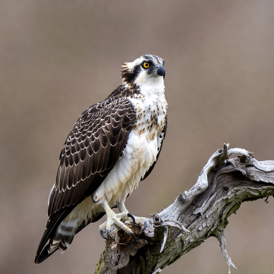 An osprey with brown and white plumage and yellow eyes perches on a weathered driftwood branch. Its wings are slightly folded, and its talons grip the wood firmly. The blurred natural background highlights the bird's detailed feathers.