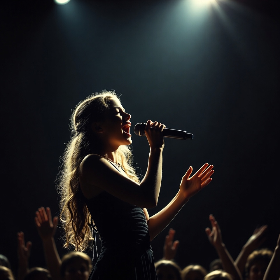 A blonde woman in a black dress sings passionately into a microphone under bright spotlights on a dark stage. Her hair flows down her back as she raises her hands expressively. A cheering crowd with raised hands fills the background.