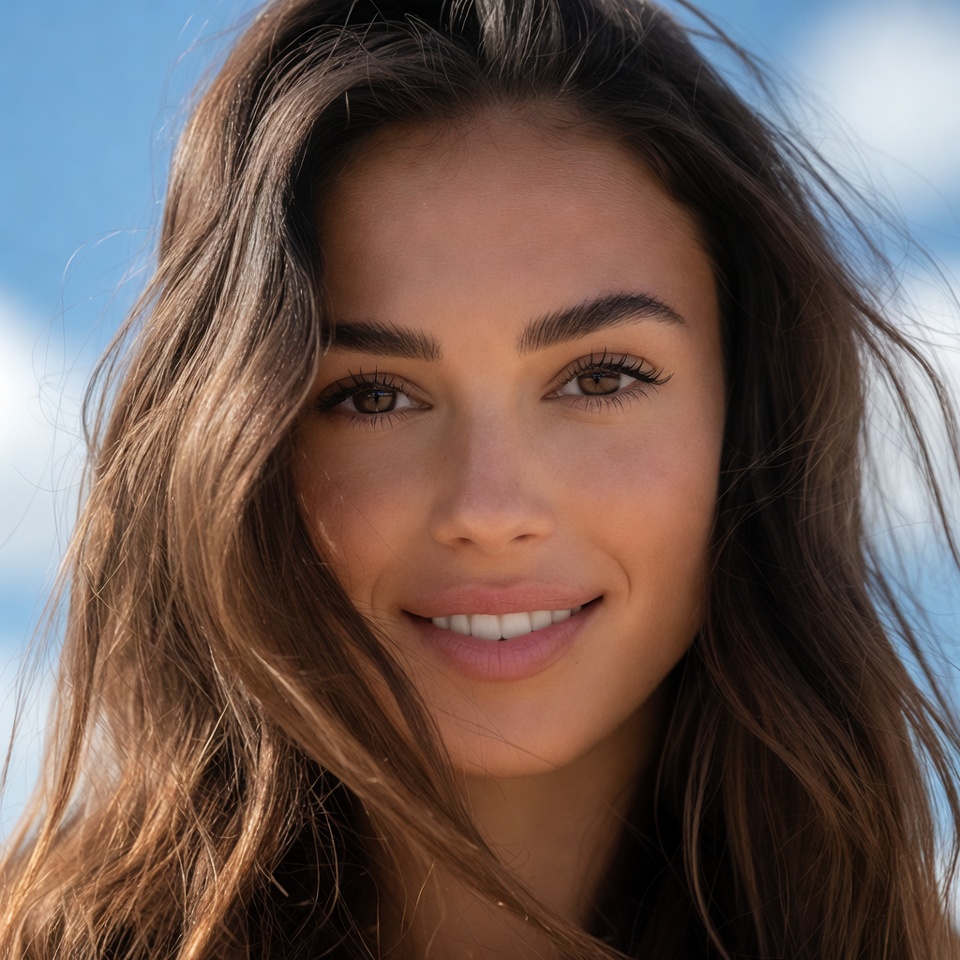 A young woman with long wavy brown hair smiles at the camera against a bright blue sky with clouds. She has brown eyes, defined eyebrows, and glossy lips. Her face is close-up with hair framing her features.