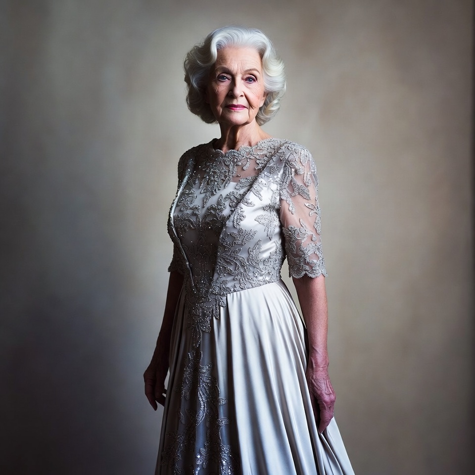 An elderly White woman with white wavy hair styled in a bob stands gracefully wearing a shimmering silver gown with intricate lace sleeves and bodice. The dress features a fitted upper body and flowing skirt, complemented by a neutral studio background. She poses confidently with her hands at her sides.