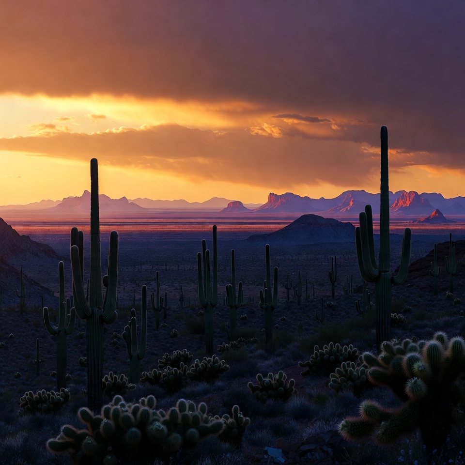 Arizona, arid, barren, cacti, desert, dramatic sky, dusk, golden light, horizon, landscape, mountains, nature, orange sky, outdoor, peaks, prickly pear, purple clouds, rocky terrain, scenery, silhouette, sunset, valley, vegetation, wilderness, saguaro cactus