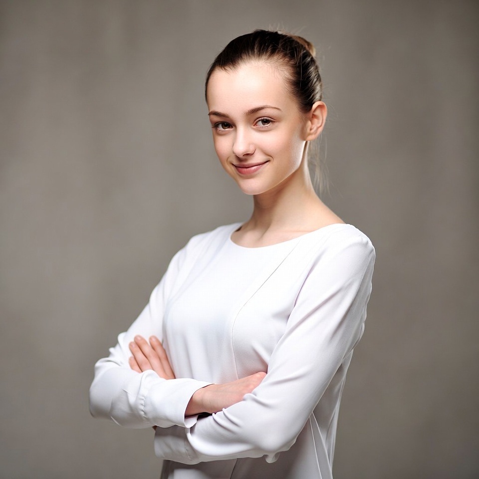 A young woman with light brown hair in a ponytail stands with arms crossed against a gray background. She wears a white long-sleeve top with a boat neck and has a gentle smile on her face. Her expression is confident and approachable.