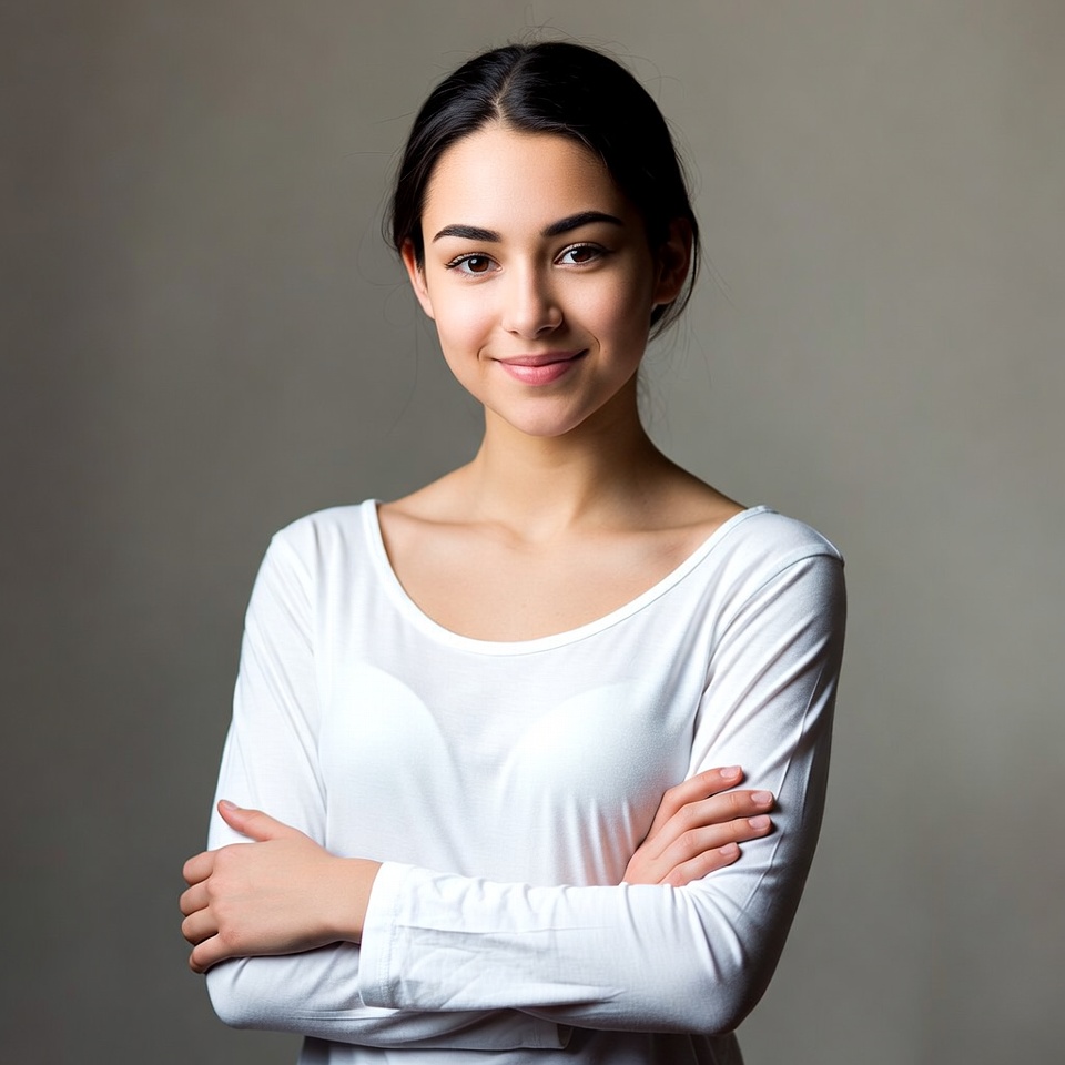 A young woman with dark hair tied back smiles gently at the camera. She wears a white scoop-neck long-sleeve top and stands with arms crossed confidently. The image features a plain gray background.