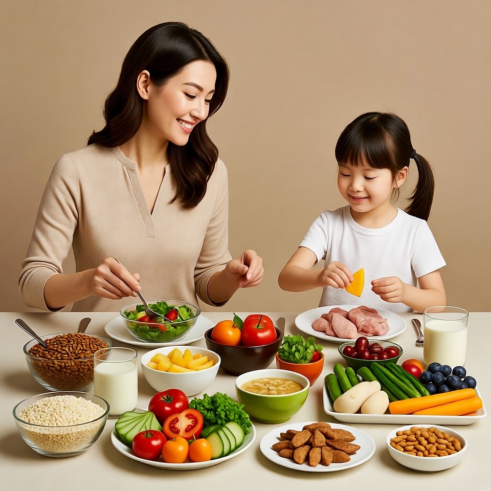An Asian mother and young daughter sit at a table filled with a colorful variety of healthy foods including vegetables, fruits, grains, meats, and dairy. The mother uses chopsticks to pick up salad while the smiling girl holds a yellow fruit slice. The beige background highlights the nutritious meal spread across multiple plates and bowls.