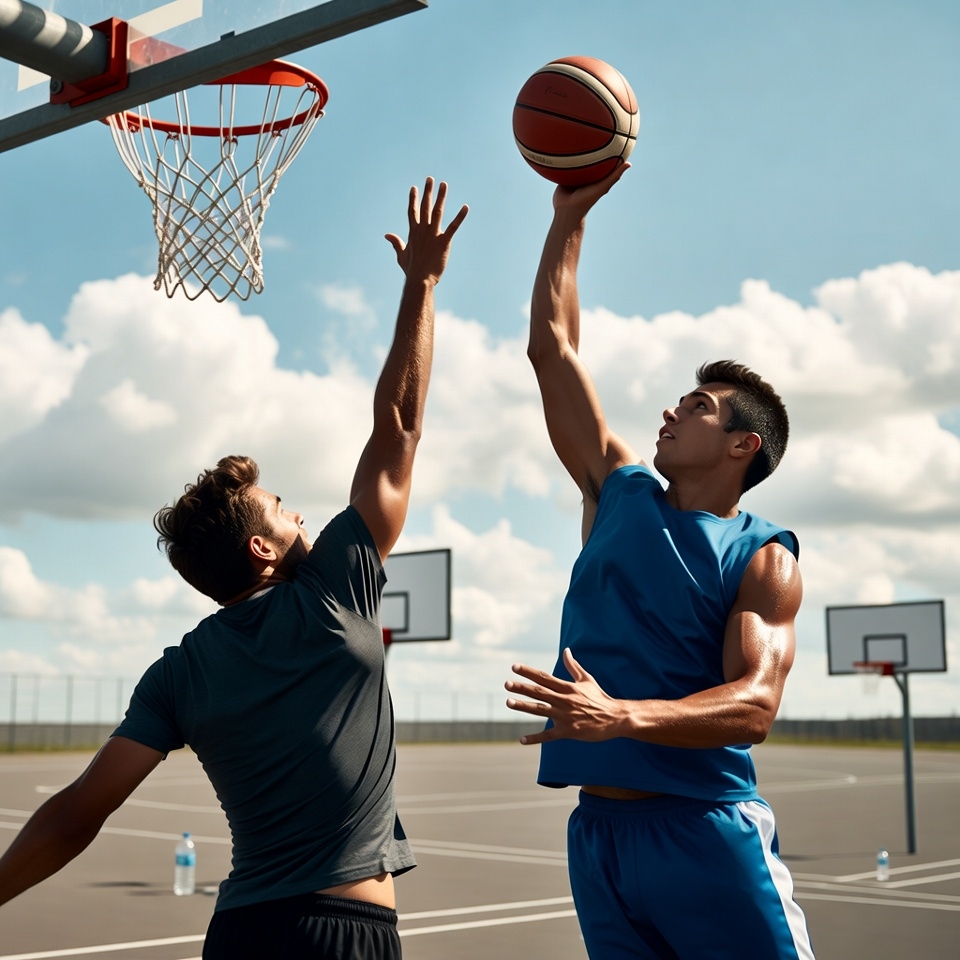 Two athletic men in basketball jerseys leap towards the hoop on an outdoor court under a blue sky with clouds. One man in a blue jersey holds the orange basketball high above the red rim, while the other in a gray jersey reaches up beside him. Water bottles sit on the concrete court nearby.