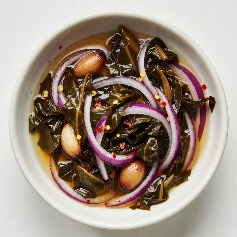 A white bowl filled with dark green collard greens submerged in a reddish-brown brine. Sliced red onions, garlic cloves, and red chili peppers are scattered throughout the pickled greens. The dish is viewed from directly above on a plain white background.