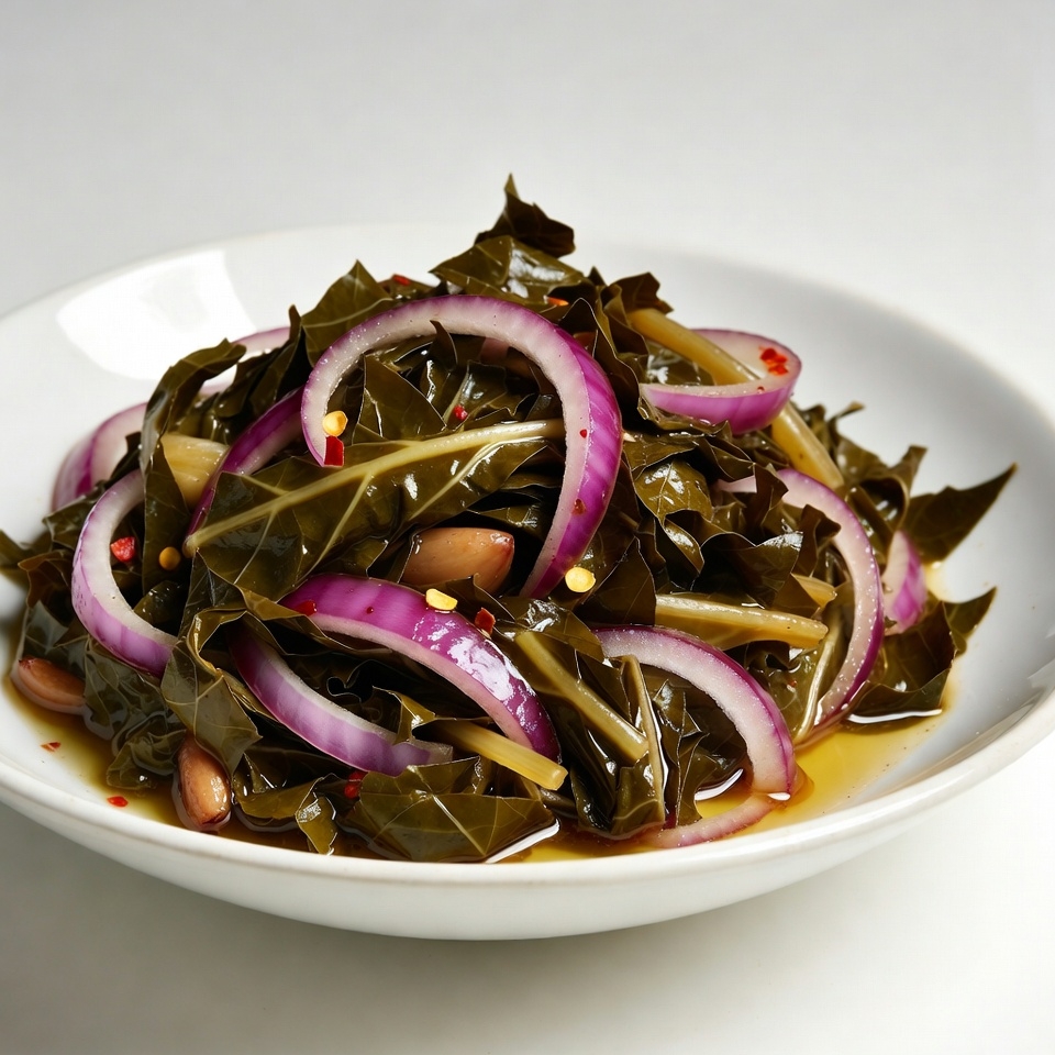 A white bowl holds a serving of cooked collard greens garnished with sliced red onions, red peppers, and peanuts. The greens are shiny with oil and arranged in a piled heap. The dish is presented on a plain white background.
