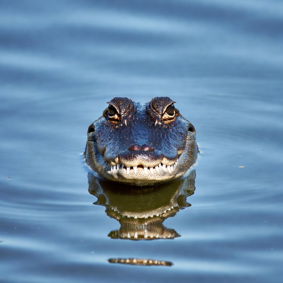 animal, blue water, crocodile, dark skin, emerging, eyes, floating, head, jaws, lake, nature, predator, reflection, reptile, scales, snout, swamp, teeth, water, wildlife, yellow eyes, alligator