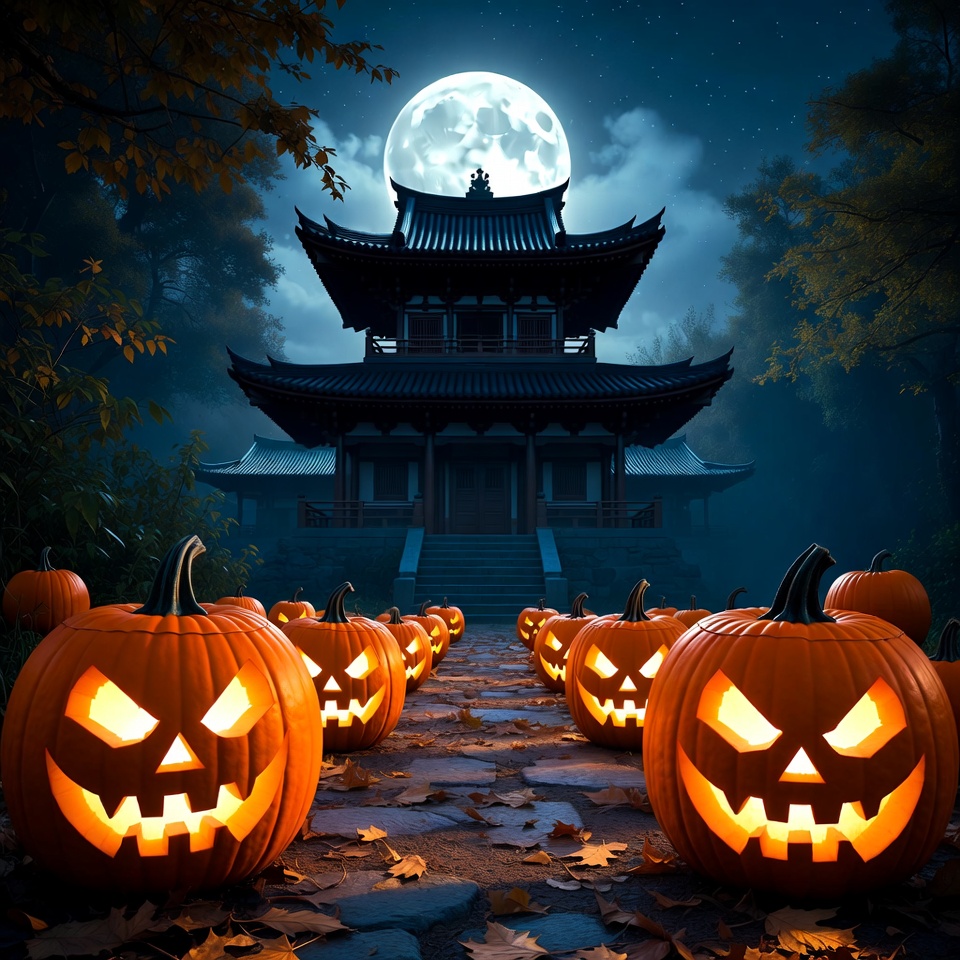 Halloween, Japanese temple, autumn forest, carved pumpkins, cloudy sky, dark roofs, eerie night, fall foliage, full moon, glowing lanterns, haunted temple, night sky, orange leaves, pagoda, pumpkin path, pumpkins, spooky, stone path, traditional architecture, jack-o-lanterns