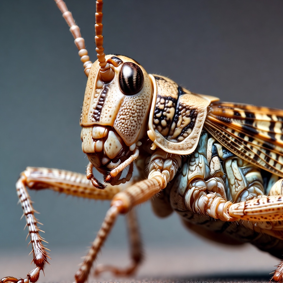 A detailed closeup view of a grasshopper with large compound eyes and striped brown body. Its antennae extend upwards and legs are positioned forward. The insect is isolated against a neutral gray background.