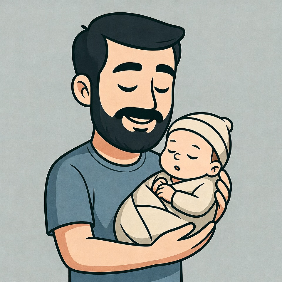 baby, beard, blanket, cartoon, clipart, closed eyes, cute, family, holding baby, illustration, isolated background, love, man, newborn, parenting, peaceful, sleeping baby, smiling, t-shirt, white cap, father