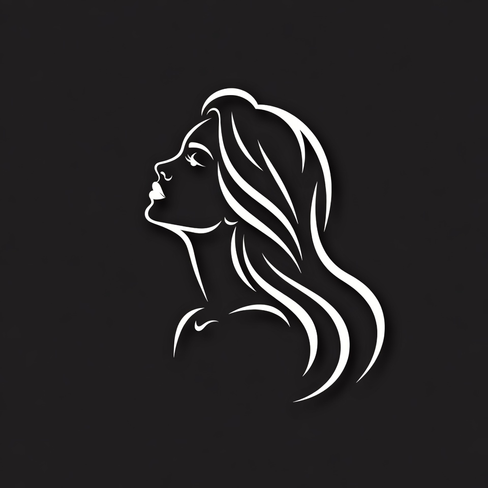 A minimalist white line art illustration depicts a woman's side profile facing right on a solid black background. She has flowing wavy long hair cascading down her back and subtle facial features including eyes, nose, and lips. The design is elegant and isolated for versatile use.
