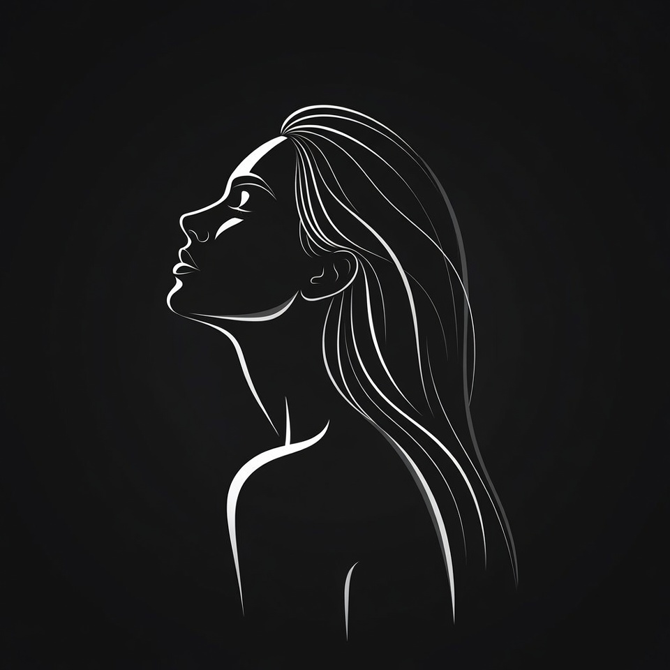 A minimalist line art illustration depicts the profile of a woman with long flowing hair, looking upwards. Her face and neck are elegantly outlined in white against a solid black background. The design emphasizes smooth curves and flowing hair strands.