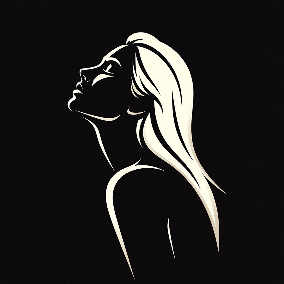 A minimalist white silhouette of a woman's profile against a black background. She has long flowing hair and is looking upward with a graceful neck curve. The illustration features smooth lines and elegant contours.