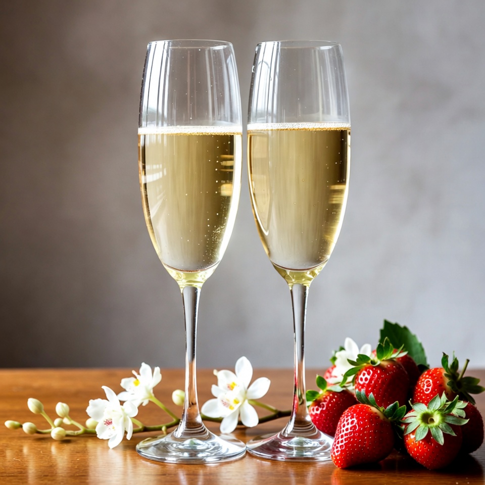 alcohol, beverage, bubbly drink, celebration, champagne, elegant, fizz, floral decoration, fresh fruit, gourmet, isolated background, luxury, new year, party, red strawberries, sparkling wine, still life, strawberries, toast, two glasses, wedding, white flowers, wooden table, champagne glasses