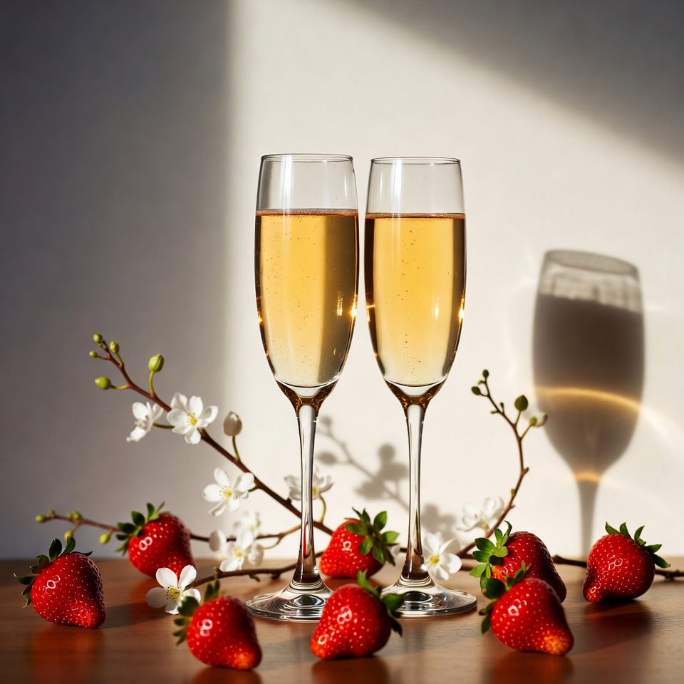 Two tall champagne flutes filled with sparkling golden champagne stand side by side on a wooden surface. They are surrounded by fresh red strawberries and delicate white cherry blossoms with green stems. Soft shadows fall on a light gray background.