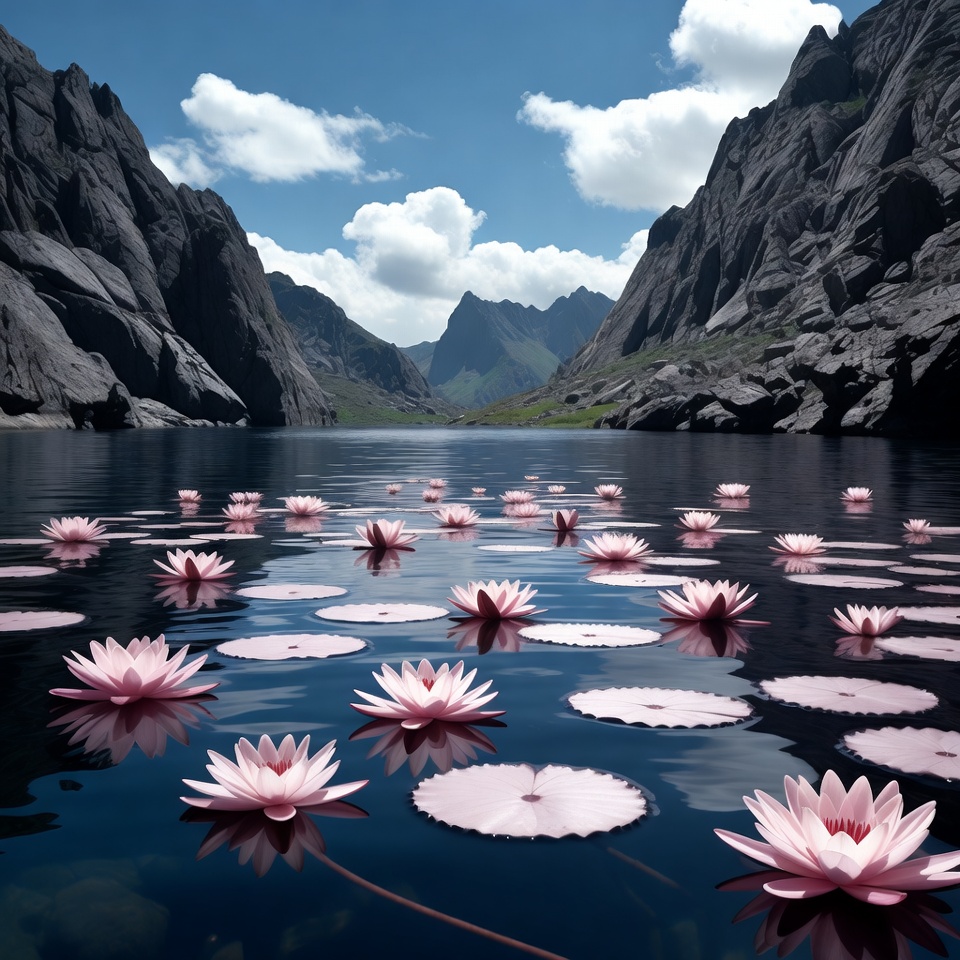 blue sky, calm lake, clear water, floating flowers, flower covered lake, lotus flowers, mountain lake, mountains, nature landscape, outdoor nature, peaceful water, peak mountains, rocky cliffs, scenic view, serene scenery, valley lake, water lilies, water reflection, white clouds, pink lotus flowers