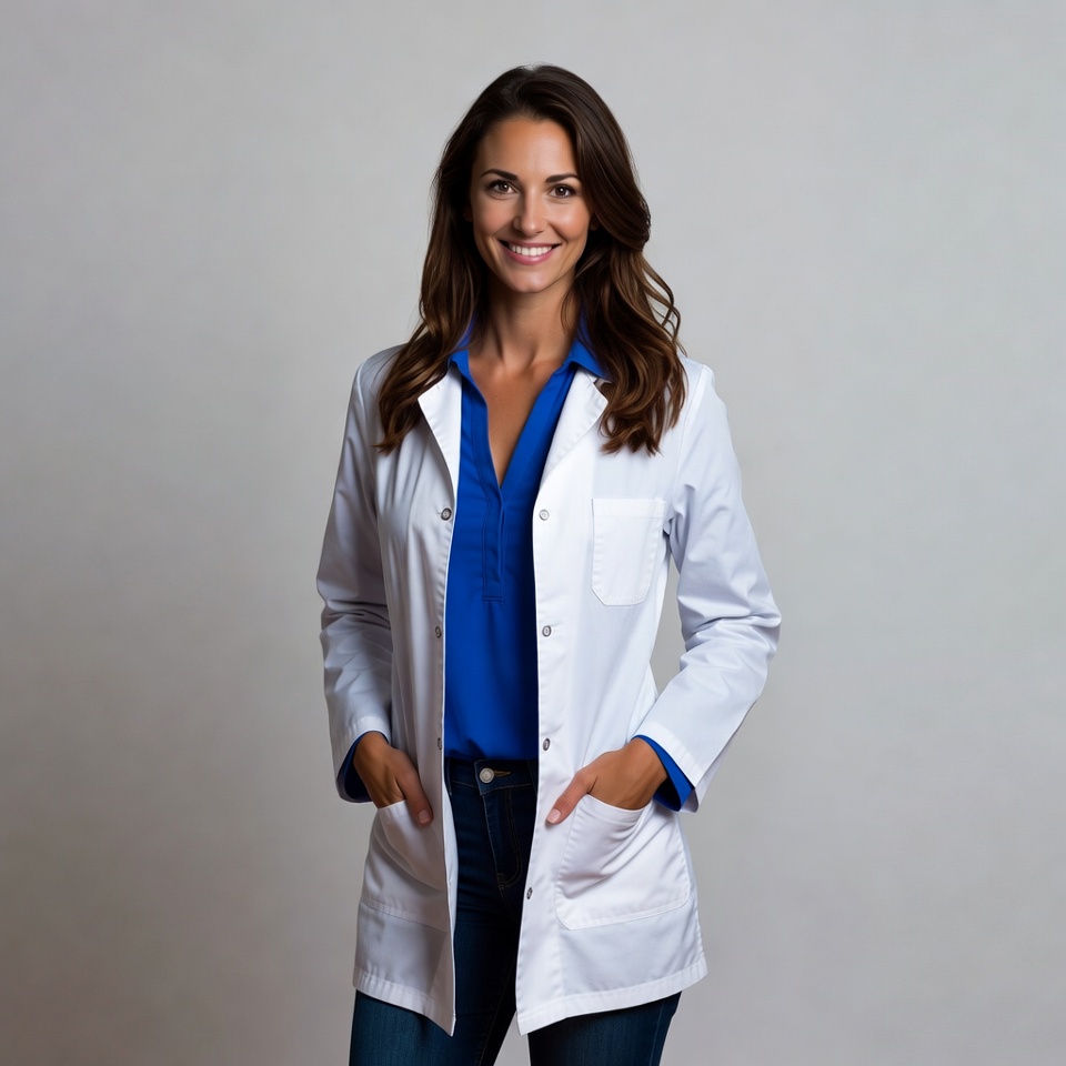 A woman with long brown wavy hair stands smiling confidently against a plain gray background. She wears a white lab coat over a blue collared blouse and fitted jeans, with hands in her pockets. Her expression is warm and professional.