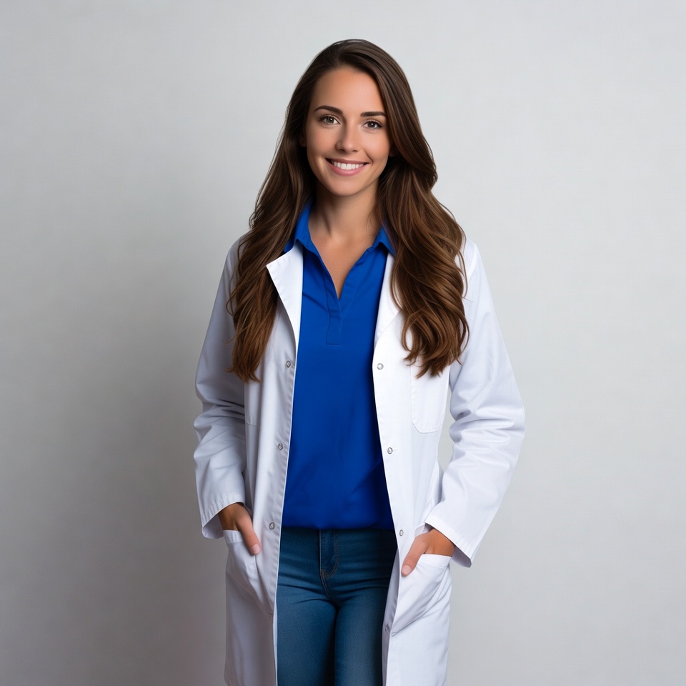 A young woman with long brown hair stands smiling confidently against a plain white background. She wears a white lab coat over a blue collared shirt and blue jeans, with hands in her pockets. Her expression is friendly and professional.