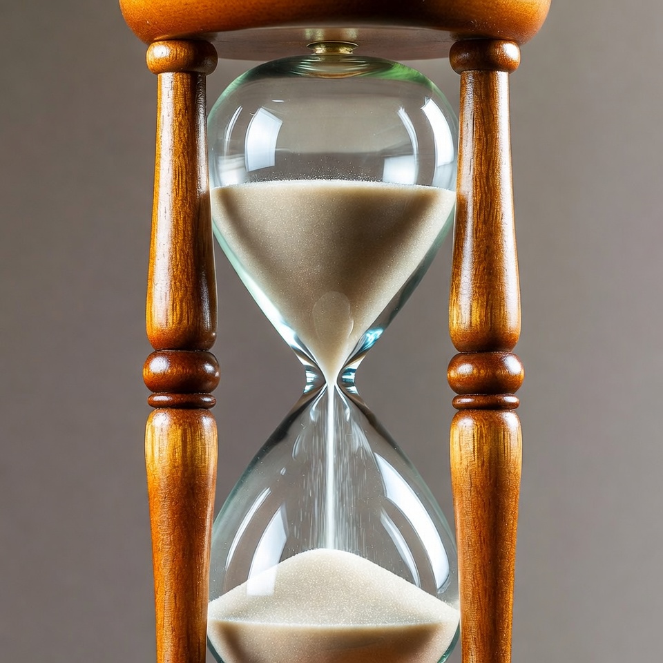 A wooden hourglass with ornate supports stands on a gray background. Fine sand flows steadily from the upper glass bulb through the narrow neck into the lower bulb. The transparent glass reveals the sand's movement clearly.