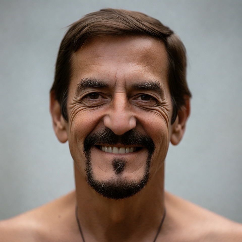 bare chest, brown hair, close-up, facial hair, goatee, gray background, happy expression, male, middle-aged, mustache, necklace, portrait, shirtless, smiling, man