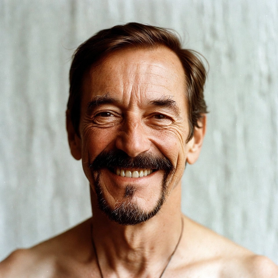 A middle-aged man with short brown hair and a thick mustache smiles warmly at the camera. He is shirtless, revealing his bare chest and a necklace, standing against a plain white wall. His expression is cheerful with wrinkles around his eyes.