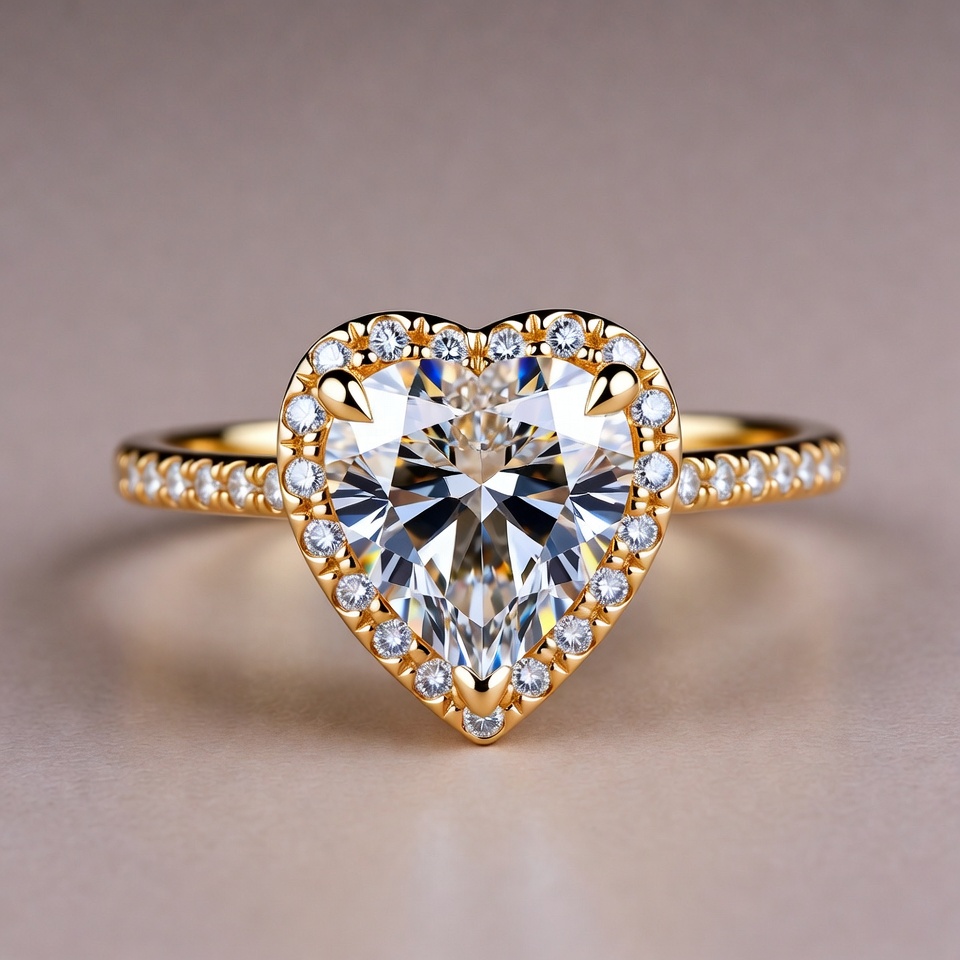 A stunning heart-shaped diamond ring features a large central diamond in a brilliant cut, surrounded by pavé diamonds on a gold band. The halo setting accentuates the heart shape with intricate detailing. The ring is displayed against a neutral beige background.