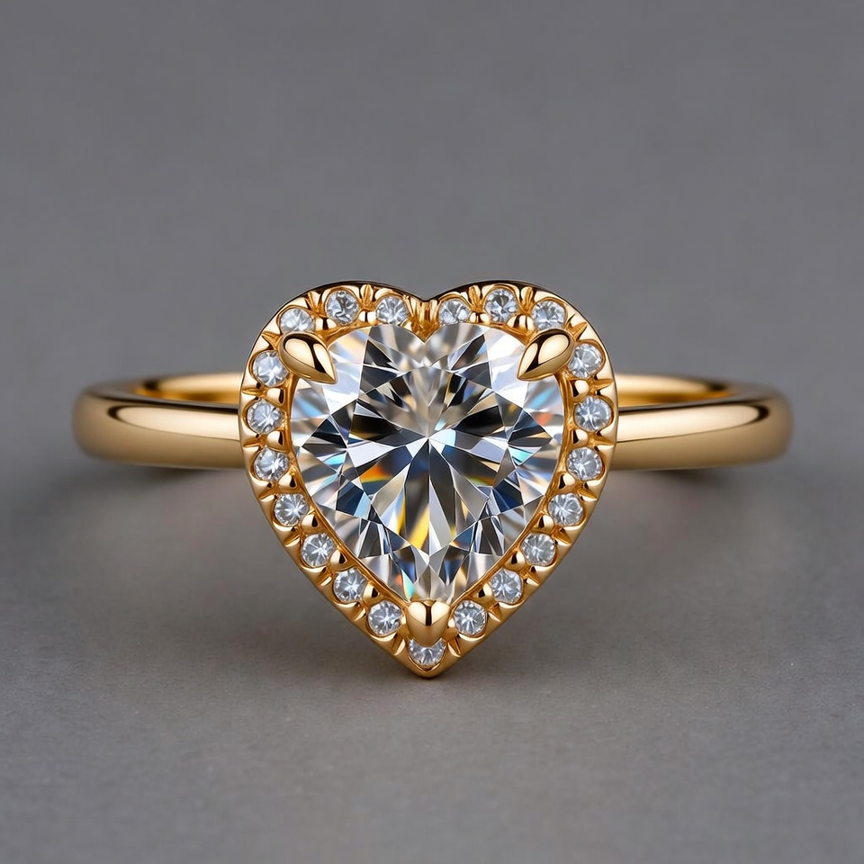 A stunning heart-shaped diamond ring features a large central diamond surrounded by smaller diamonds in a gold halo setting. The band is smooth polished gold, emphasizing the romantic heart design. The ring is displayed against a plain gray background.