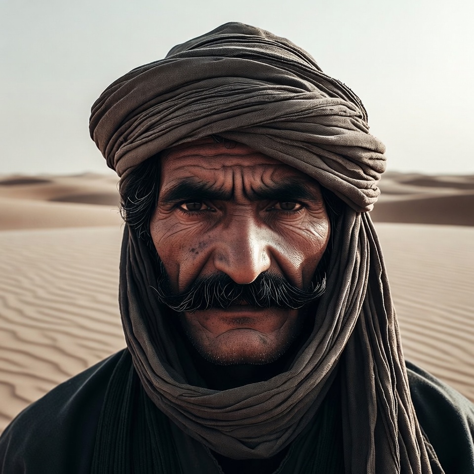 Bedouin, Middle Eastern, arid landscape, beard, brown turban, dark clothing, desert, ethnic portrait, headscarf, intense gaze, male, mustache, nomadic, older man, portrait, robe, sand dunes, sandy background, traditional attire, turban, weathered face, man