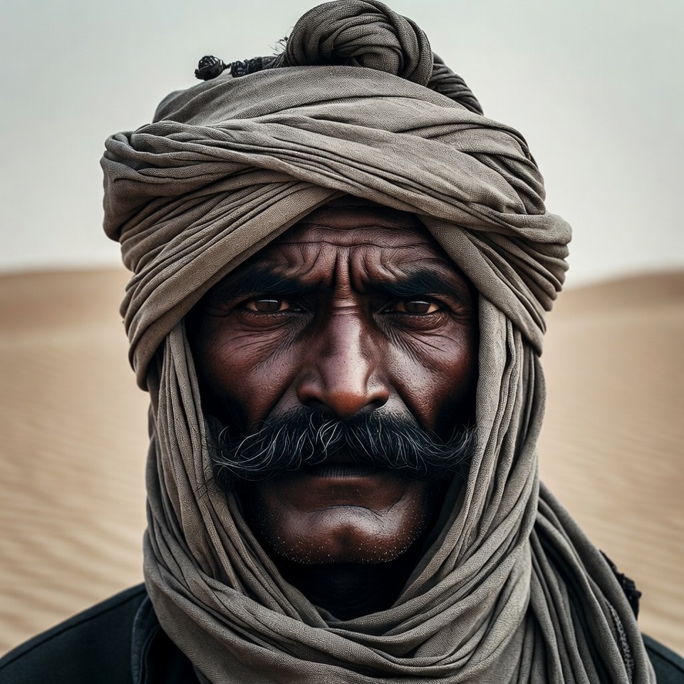 Bedouin style, Middle Eastern, dark skin, desert, gray turban, headscarf, intense gaze, isolated background, male, mustache, nomadic, portrait, sand dunes, sandy background, traditional attire, turban, weathered face, man