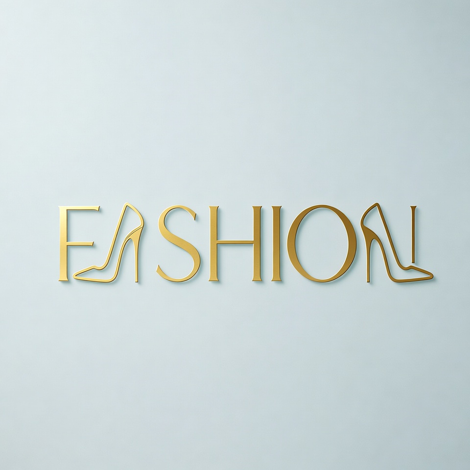 The word 'FASHION' is crafted in elegant gold letters on a light blue background. High heel shoe silhouettes are integrated into the 'F' and final 'N' letters. The design features a metallic gold 3D effect.