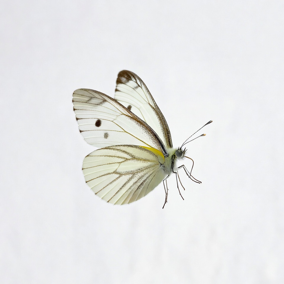 A delicate white butterfly with translucent wings and black spots hovers against a plain white background. Its wings feature thin yellow veins and subtle brown edges. The butterfly is captured in mid-flight, showcasing its slender body and long antennae.