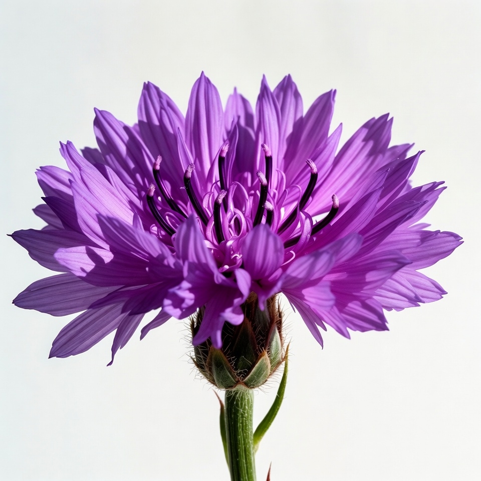 A vibrant purple cornflower blooms prominently against a plain white background. Its spiky purple petals radiate from a dark central cone, with thin black stamens visible in the core. The green stem supports the flower, isolated for a clean macro view.