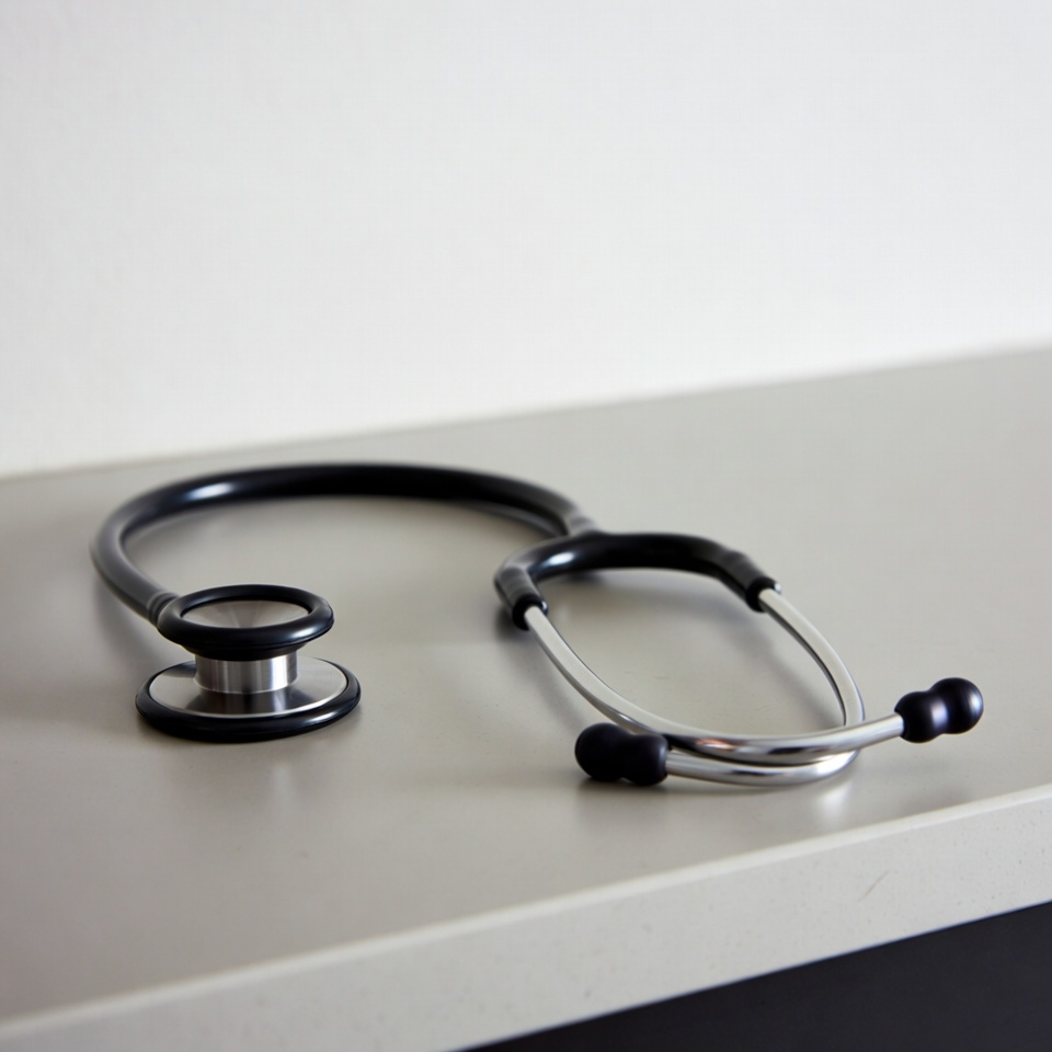 A black stethoscope with silver chest piece and rubber ear tips rests on a light gray table. The tubing is curved and the diaphragm faces upward. The background is plain white.