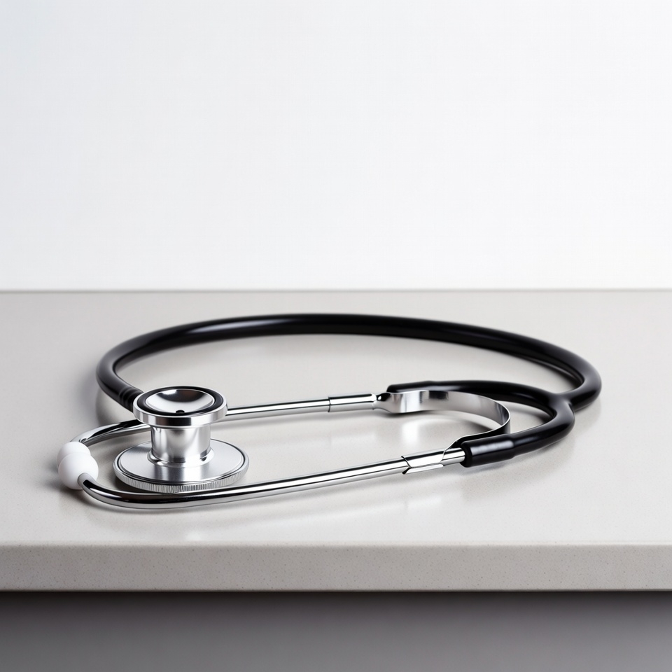 A silver stethoscope with black tubing rests on a light gray table. The earpieces and chest piece are prominently visible against a white background. The medical instrument is positioned in a curved layout.
