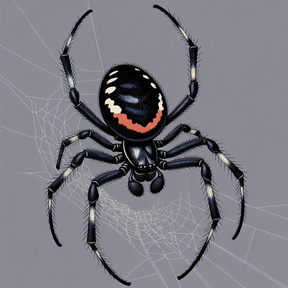 animal, arachnid, black widow, clipart, creepy, detailed drawing, eight legs, fangs, gray background, hairy, illustration, insect, isolated, legs, macro, red markings, vector art, venomous, wildlife, spider