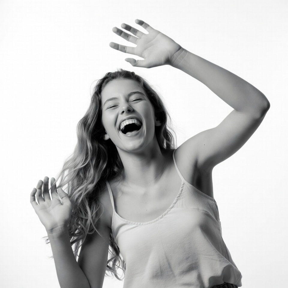 White, arms raised, black and white, blonde hair, exuberant, female, hands up, happy expression, joyful, laughing, laughter, monochrome, open mouth, portrait, raised hands, smiling, squinted eyes, studio photo, tank top, wavy hair, white background, young woman, woman