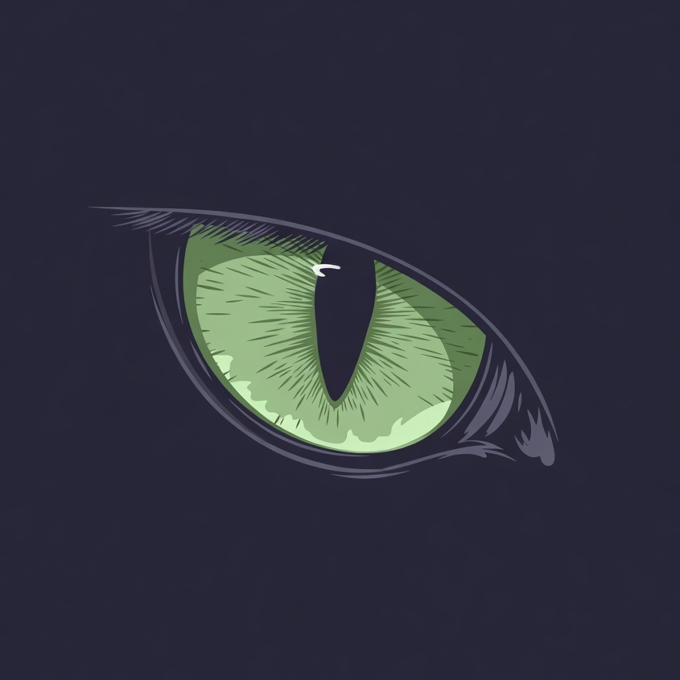 A detailed digital illustration of a single green cat eye with a black slit pupil stares intensely from a dark background. The eye features intricate green iris patterns, dark eyelashes, and subtle shading for depth. It is isolated on a solid navy backdrop.