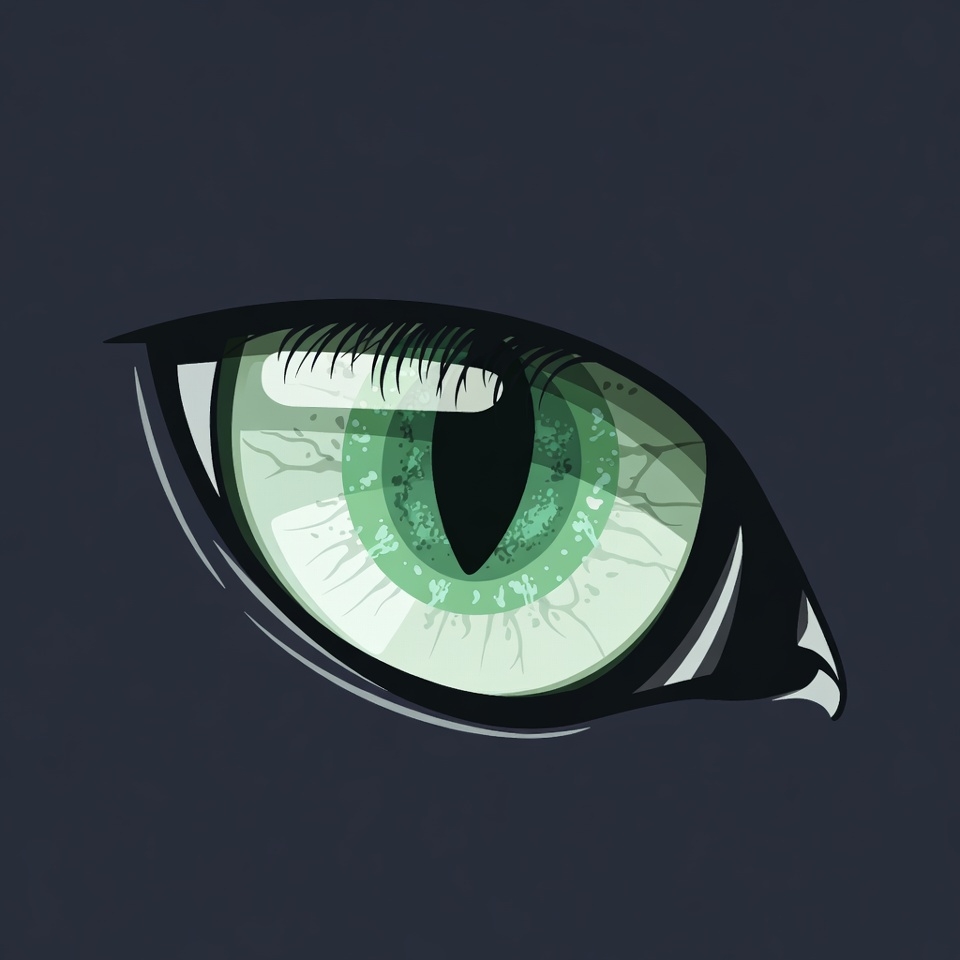A detailed digital illustration of a single green cat eye with a vertical slit pupil. The eye features prominent black eyelashes and intricate veining in the iris. It is set against a dark navy background, isolated for emphasis.