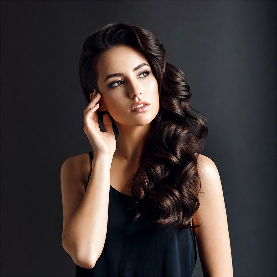 A young woman with long wavy dark brown hair poses thoughtfully against a dark gray background. She wears a sleeveless black top and touches her face gently with one hand. Her expression is serene with subtle makeup highlighting her features.