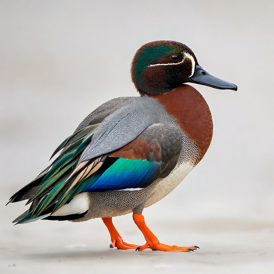 A vibrant male Mandarin Duck stands in profile against a plain white background. It features a reddish-brown head with green and white facial markings, a black bill, gray wings, and bright green and blue wing feathers. Its orange legs and feet are visible as it stands on a white surface.