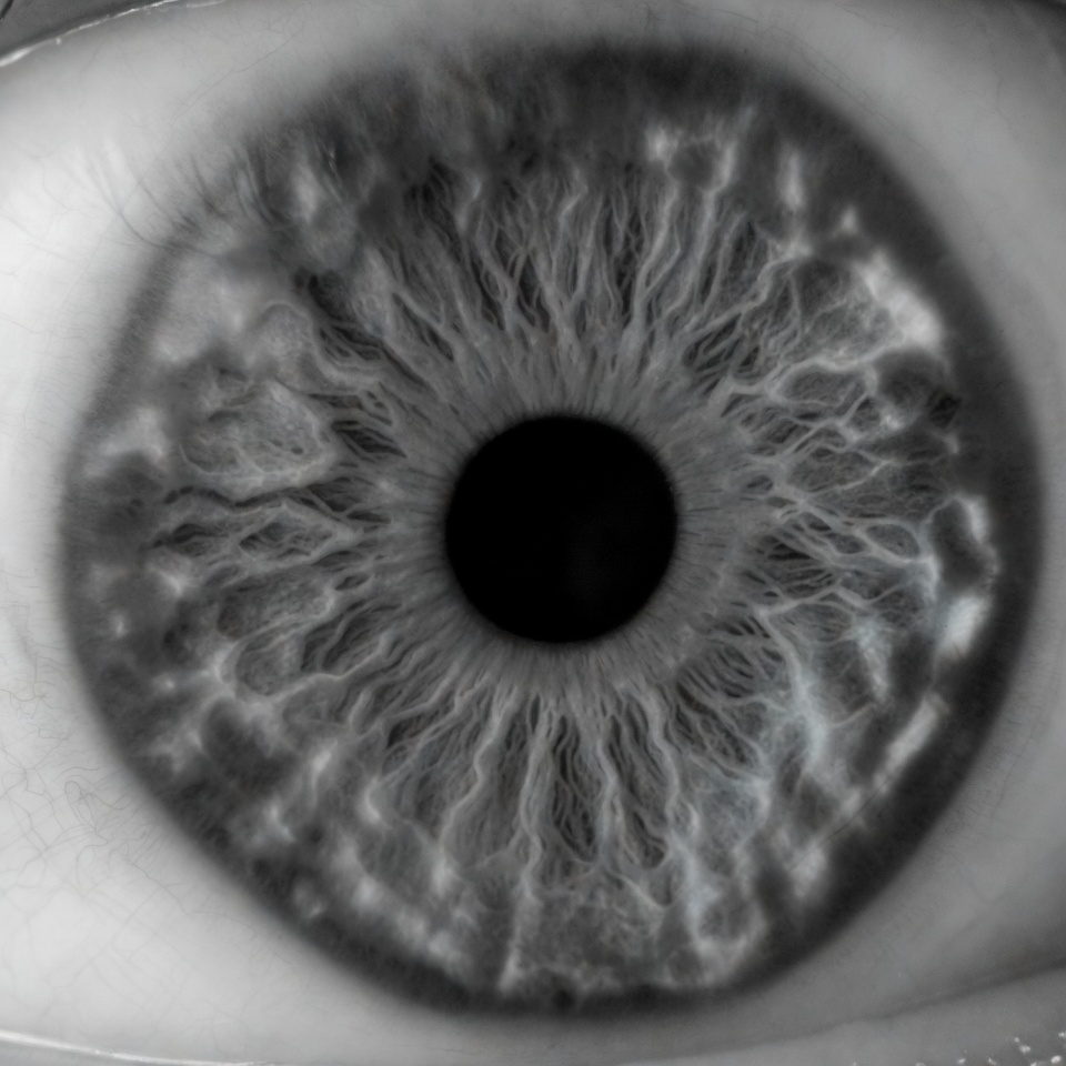 A detailed close-up of a human eye with a dark pupil at the center. The iris displays intricate patterns of light and dark shades in grayscale. Fine eyelashes frame the eye, highlighting its textured surface.