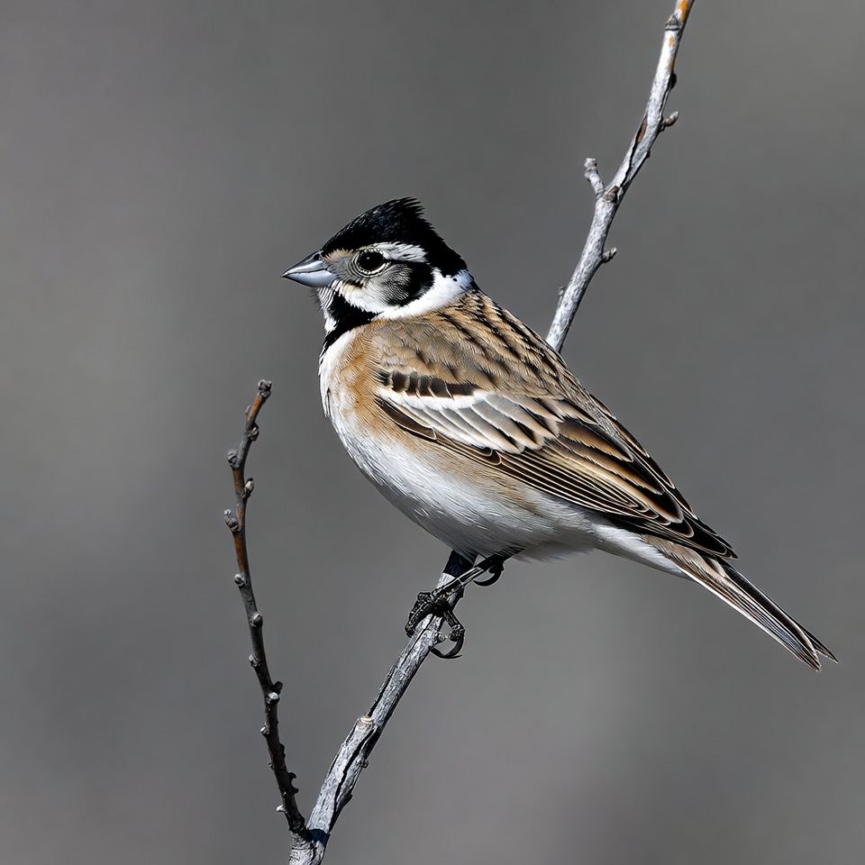 avian, beak, bird, birdwatching, black crest, branch, brown feathers, feathers, gray background, male bird, nature, ornithology, perched, songbird, sparrow, striped wings, tail, white throat, wildlife, Lark Bunting