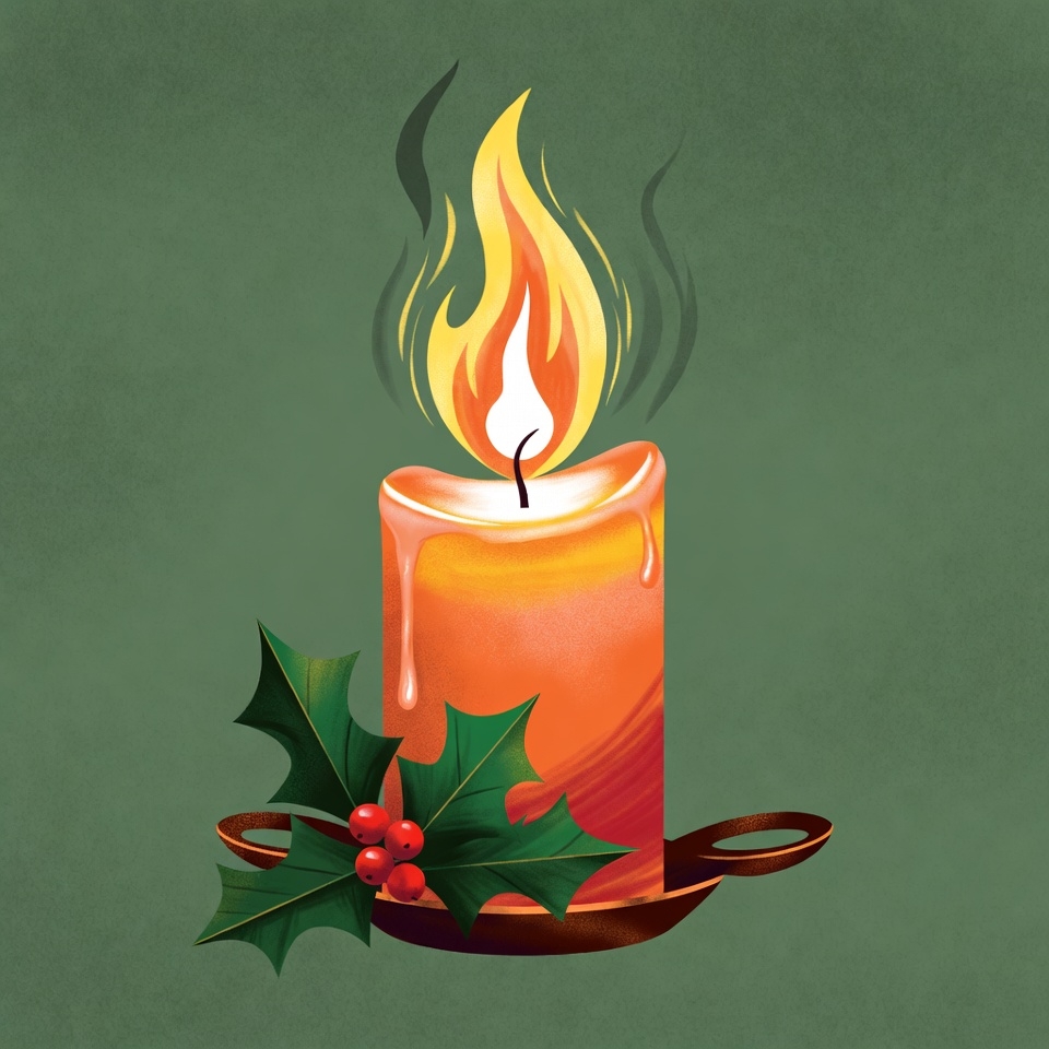 Christmas candle, burning candle, candle holder, clipart, dripping wax, flame, green background, holiday decoration, holly, holly leaves, illustration, isolated background, orange candle, red berries, smoke, yellow flame, candle