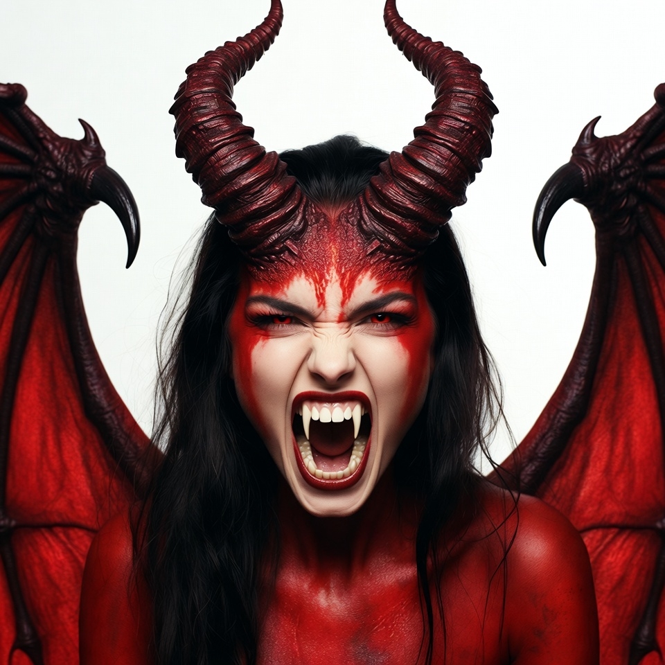 Halloween, White, bat wings, black hair, body paint, claws, costume, devil, fangs, fantasy, female, fierce expression, horns, isolated background, makeup, portrait, red demon, red makeup, roaring, scary, succubus, supernatural, wings, woman, demon woman