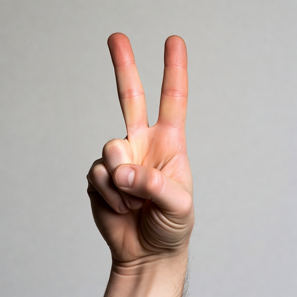 A close-up of a hand with fingers extended in a V-shape forming the peace sign against a plain white background. The hand features light skin with visible knuckles, nails, and fine hairs on the back. The thumb is tucked into the palm.